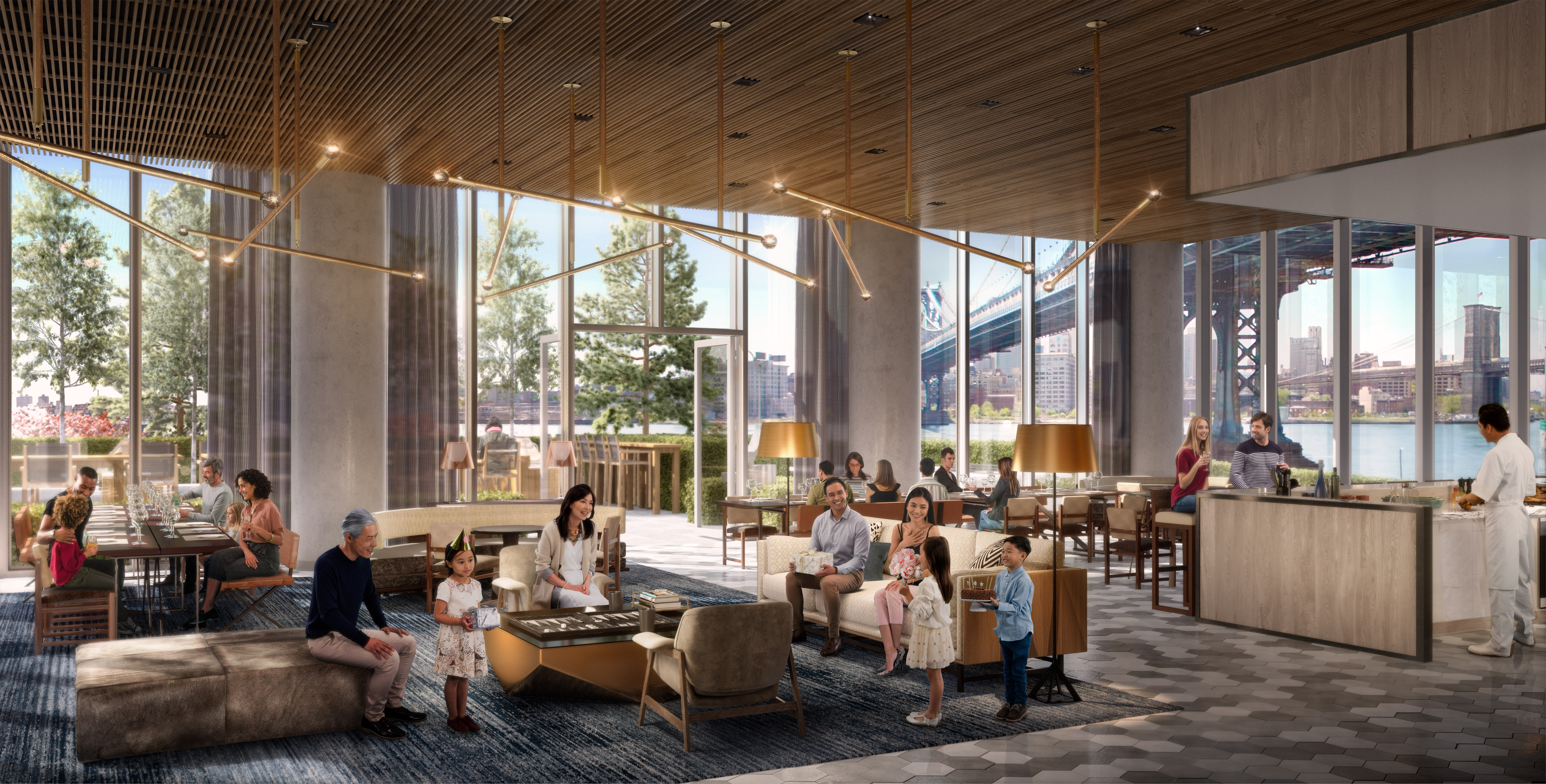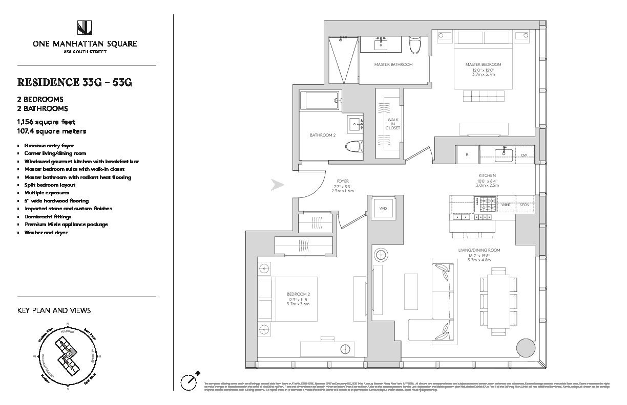 "Live for Free" NO CARRYING COSTS for: -5 Years on One Bedroom Residences -7 Years on Two Bedroom Residences -10 Years on Three Bedroom Residences Incentive ends July 4th. Residence 33G is a 1,156 square foot two bedroom, two bathroom with an open gourmet kitchen and breakfast bar. This spacious corner residence faces North East and South East, with expansive City and East River views. Warm, modern interiors are brought to life by the renowned design team at Meyer Davis Studio. This residence features imported stone and custom finishes, premium Miele appliance package, 5" wide stained oak flooring, master bath with custom wood cabinetry, marble tile walls and mosaic floors with radiant heat, under-mount Wetstyle sink with glass vanity top and Dornbracht polished chrome faucets and a washer and dryer. One Manhattan Square is an 80-story, 823-foot modern glass tower condominium located along the East River waterfront on the Lower East Side with unobstructed panoramic water and skyline views, with over 100,000 square feet of every conceivable luxury. Designed by Adamson Associates Architects the Toronto-based firm which served as executive architects on The Shard at London Bridge the 823 foot tower will be a striking addition to the Manhattan skyline. The building is clad in a delicate mix of natural elements and modern accents, including a sleek glass curtain wall that reflects the river below. Other architectural highlights include the use of muntz metal on the podium and entranceway that provides a warm, earthy tone. Residents of One Manhattan Square will have over 100,000 square feet of resort-like amenities designed by Meyer Davis Studio spanning across four floors with rest, relaxation and entertainment in mind. The Club Level features a luxurious spa centered around a tranquil courtyard, Hamam with cold plunge pool, 75' swimming pool, children's wading pool, treatment rooms, hot tub, sauna, full basketball court, two-lane bowling alley, squash court, golf simulator, 70-person movie theater and performance space, cellar bar and lounge, wine tasting room, cigar room, pet spa and laundry and alterations. The Ground Floor features a 24-hour doorman and concierge, double-height grand lobby with two seating areas and fire places, private motor court, package delivery and refrigerated storage, dry cleaning valet, and complimentary bicycle storage. The Third Floor Garden Level is devoted to indoor and outdoor opportunities featuring a culinary lounge and demonstration kitchen, business center, teen game room and indoor children's playroom. The design surrounding One Manhattan Square's 45,000 square foot oasis with lush gardens is by the celebrated design firm West 8 landscape architects, known for their work at The Hills at Governors Island and Miami's Soundscape Gardens. Outdoor amenities feature sumac meander, pike slip courtyard, birch garden, children's playground, social courtyards, relaxation lawns, fire pits, outdoor kitchen and dining, herb garden, adult treehouse, tea pavilion, outdoor ping-pong, putting green, stargazing observatory, and a 93' covered dog run. Finally, the Fitness Level features state-of-the-art weight room, cardio room, four fitness studios, cardio, dance and yoga classes. It all thrives on the Lower East Side. Dotted with fine dining restaurants, trailblazing bars, boutique shops and avant-garde galleries, there's no shortage of entertainment options in the area. The transforming neighborhood is buzzing with energy and is within proximity of a number of landmarks including the South Street Seaport, Manhattan Bridge and the East River Esplanade. One Manhattan Square was designed to appeal to those that want it all iconic views, lush gardens, gorgeous homes, anticipated 20-year tax abatement and an over the top package of unprecedented amenities. Immediate occupancy. The complete offering terms are in an offering plan available from Sponsor. File No. CD15-0185. Sponsor: CPS Fee Company LLC, 805 Third Avenue, Seventh Floor, New York, NY 10022. Sponsor reserves the right to make changes in accordance with the terms of the offering plan. Equal Housing Opportunity.
