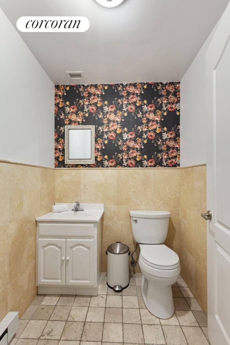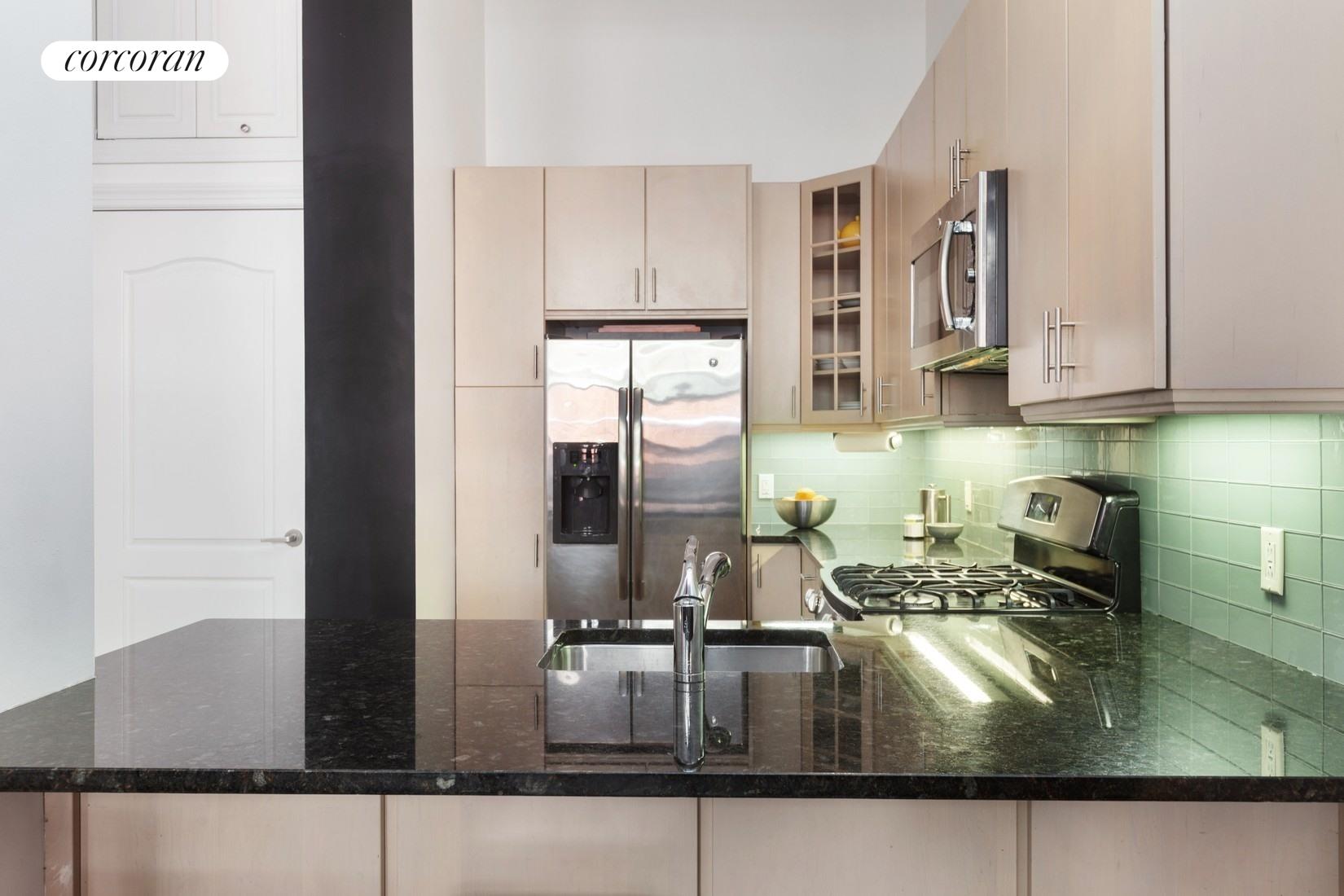 The kitchen features ample counter space, great storage, stainless appliances, and opens into the large living area. The living area has great light, and room for a large dining table offering a myriad of staging options. This duplex apartment has a master bedroom on the main floor and a large home office that can be utilized as a nursery or second bedroom. The ground floor has an additional home office that is currently configured as a third bedroom, a designated entertainment room with built-in shelving and another windowed third home office area, with additional room for storage and entertaining. The apartment has central A/C and heat, a dishwasher, and a washer/dryer in the unit.