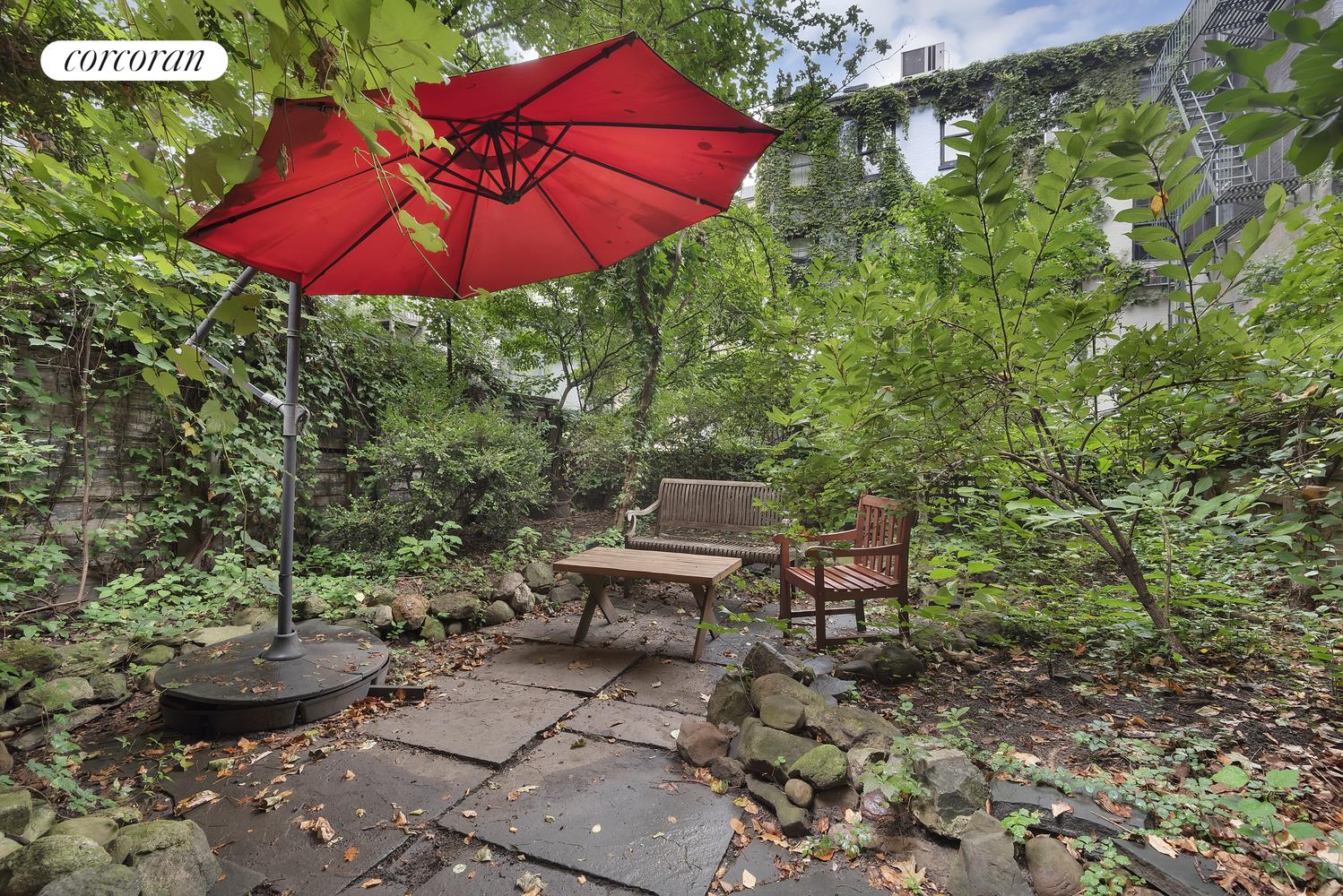 The garden floor is currently configured with a 27? living / dining room, kitchen, sunroom, bedroom, one and a half bathrooms, and a beautiful and lush, 36? private garden.